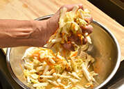 - 1.白菜の葉はざく切り、茎は5cm長さの拍子木切り、にんじんは5cm長さの千切りにする。