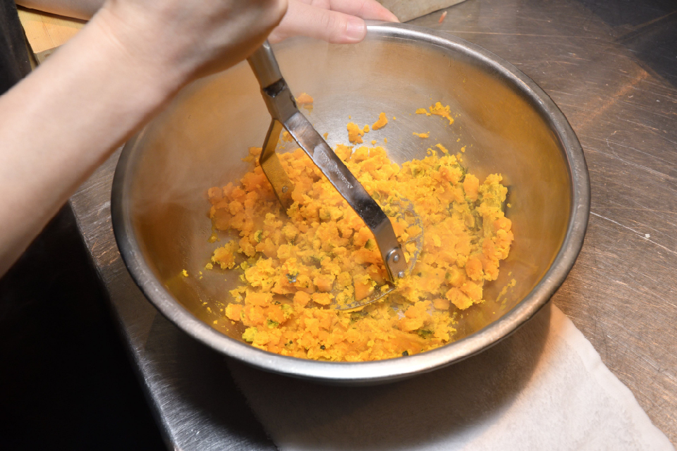 かぼちゃにはデンプン質が含まれているので、熱いうちに皮ごと潰す。