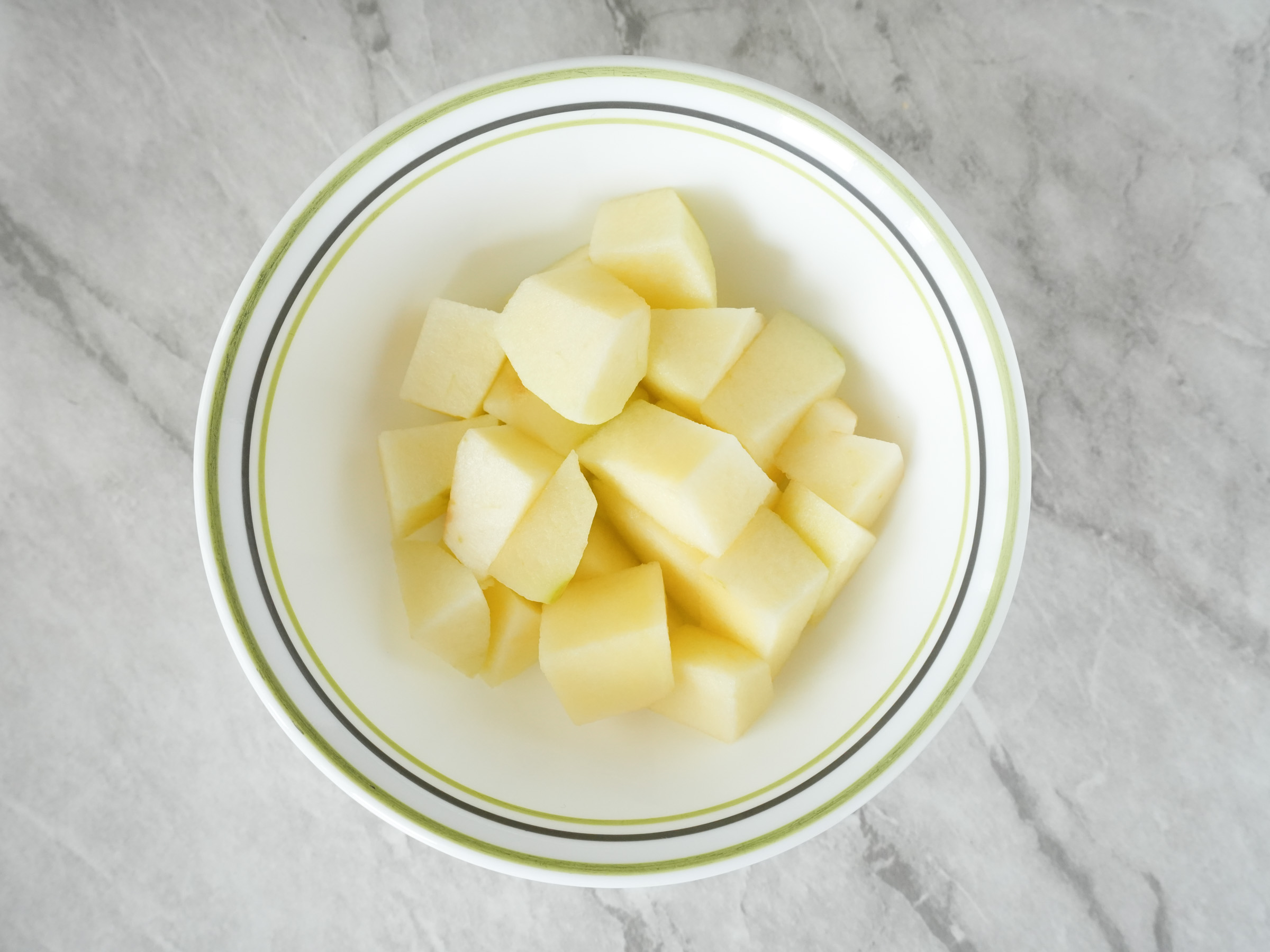 - りんごは皮をむき種を取り除き、2cm角に切る。