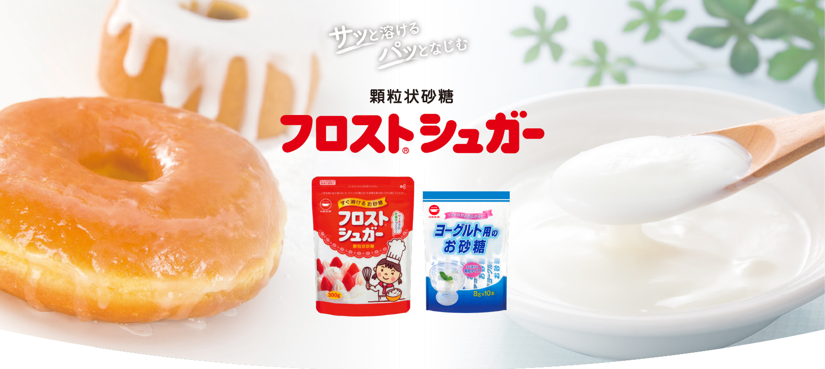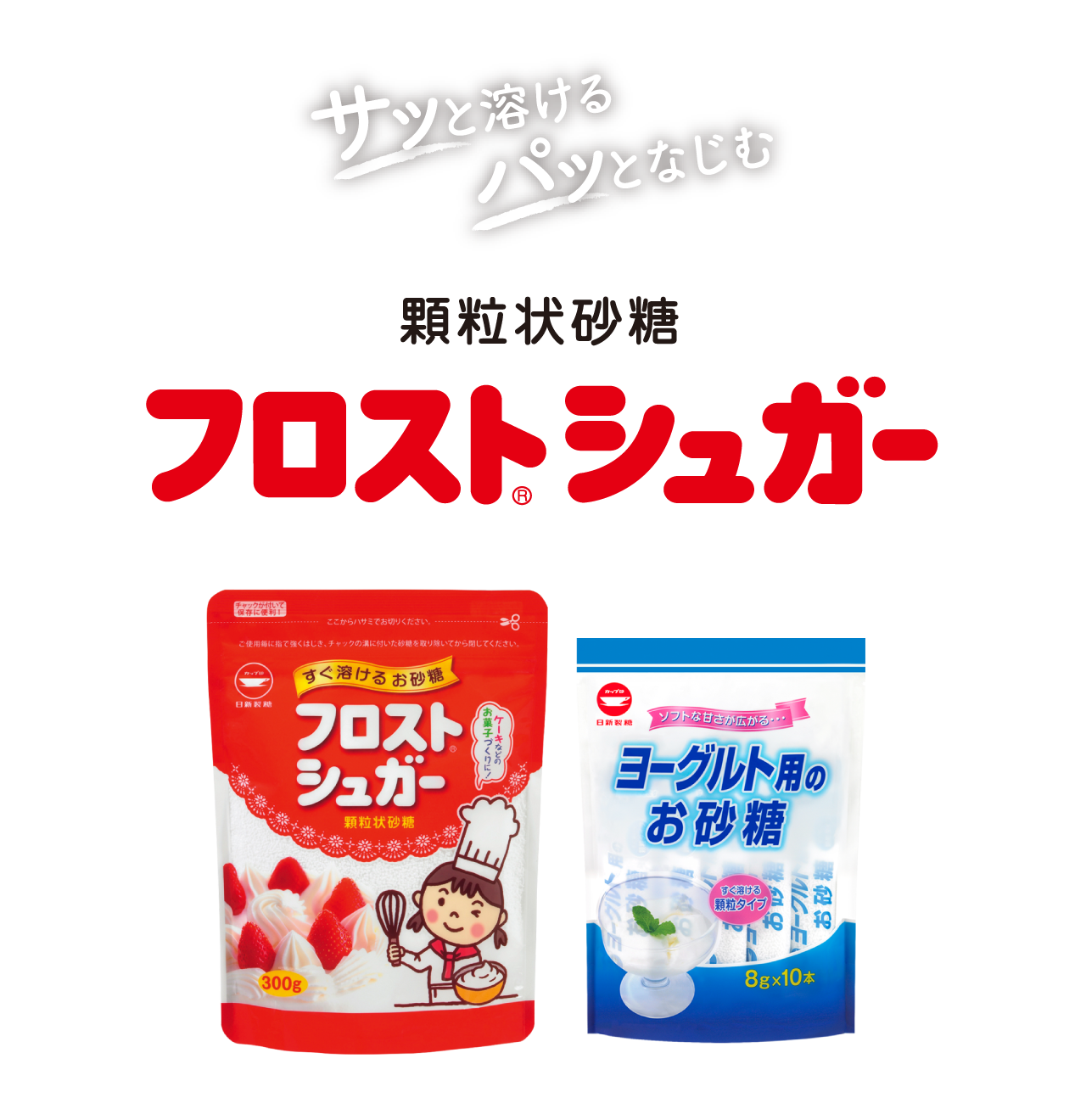 フロストシュガーは、多孔質(細かい穴の空いた構造になっている性質)で顆粒状のお砂糖です。「素早く溶けるお砂糖が欲しい」というお客様のご要望にお応えし、当社が開発しました。霜のように水にすぐ溶け、フォンダンなどの砂糖衣がけを容易に作れる、という特長から、商品名は、霜=frost、衣がけする=frostingという英語に由来し、「フロストシュガー(Frost Sugar)」と名づけられました。