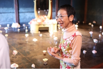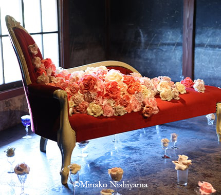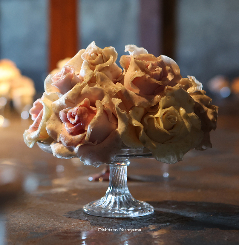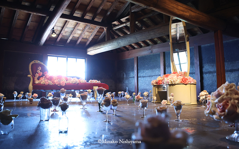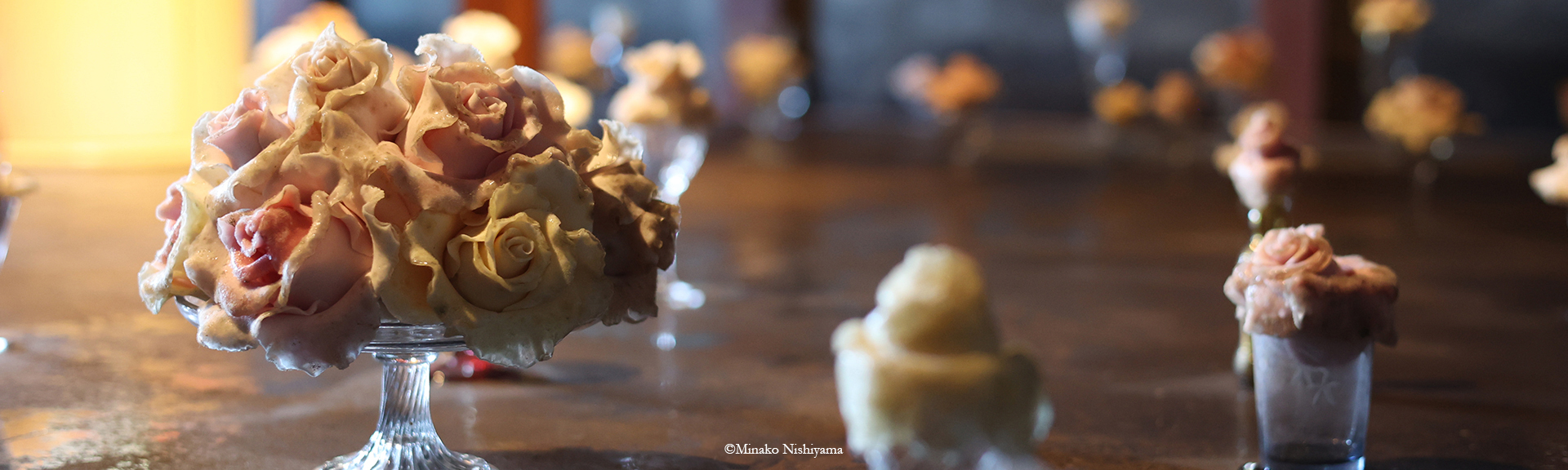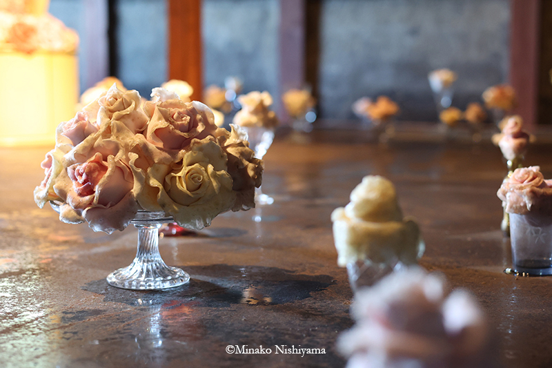 そんなことを思いながら通っているうちに、記録に残らない女性たちの、楽しげでひそやかな生活があったに違いない、ここに住んで育った乙女達がいたはずだ。そんな女性たちへのオマージュとして、バラを飾ろうという思いに至りました。結果、グラスに一輪ずつ女性に見立てて飾ったシュガーローズが約130個にもなりました。