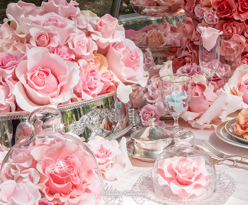 こうした作品を作ってきましたが、シンデレラの靴も触ると崩れてしまうティアラやクラウンも、触りたくても触れない憧れとか欲望、そんな意味で作っていて、その延長でバラも自然に作るようになりました。繊細なアイシングと違ってシュガーペーストは、私でもできそうに感じ、先生に教えてもらうようになりました。 シュガークラフトの世界では、バラはお菓子のデコレーションとして最も人気の一番よく使われるモチーフなんです。